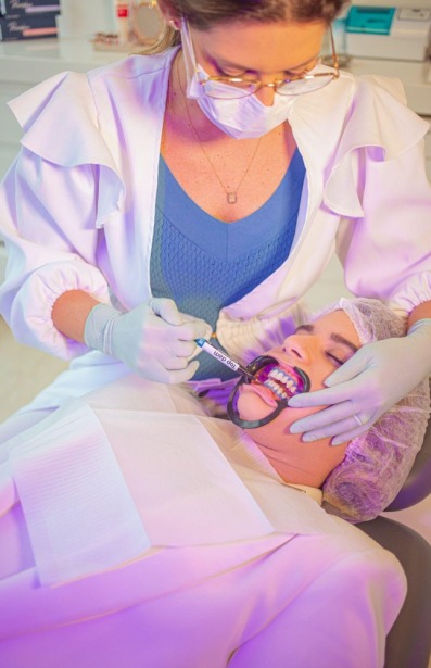 O clareamento dental é um tratamento estético que deixa os dentes mais brancos. “Basicamente, aplica-se um gel clareador (peróxido de carbamida ou peróxido de hidrogênio) nos dentes do paciente. Quimicamente, esse produto libera oxigênio e subprodutos dentro do dente, e esse oxigênio quebra as moléculas grandes e escuras que causam alteração de cor.”